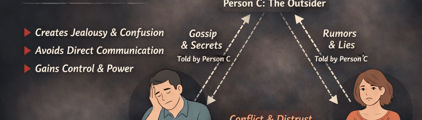 Triangulation is a psychological manipulation pattern where a third person is deliberately pulled into a situation to create confusion, control, jealousy, power imbalance, or emotional instability between two people.